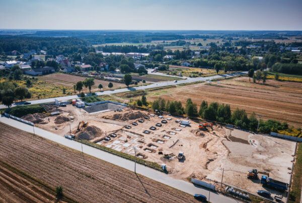 Duży postęp widać również na zewnątrz budynku. Uformowany i uszczelniony został zbiornik retencyjny, którego dno zostało wyłożone membraną i pokryte warstwą kamieni oraz kruszywa. Na znacznej części placu manewrowego ułożono już kostkę brukową, co wyraźnie przybliża teren inwestycji do finalnego kształtu.